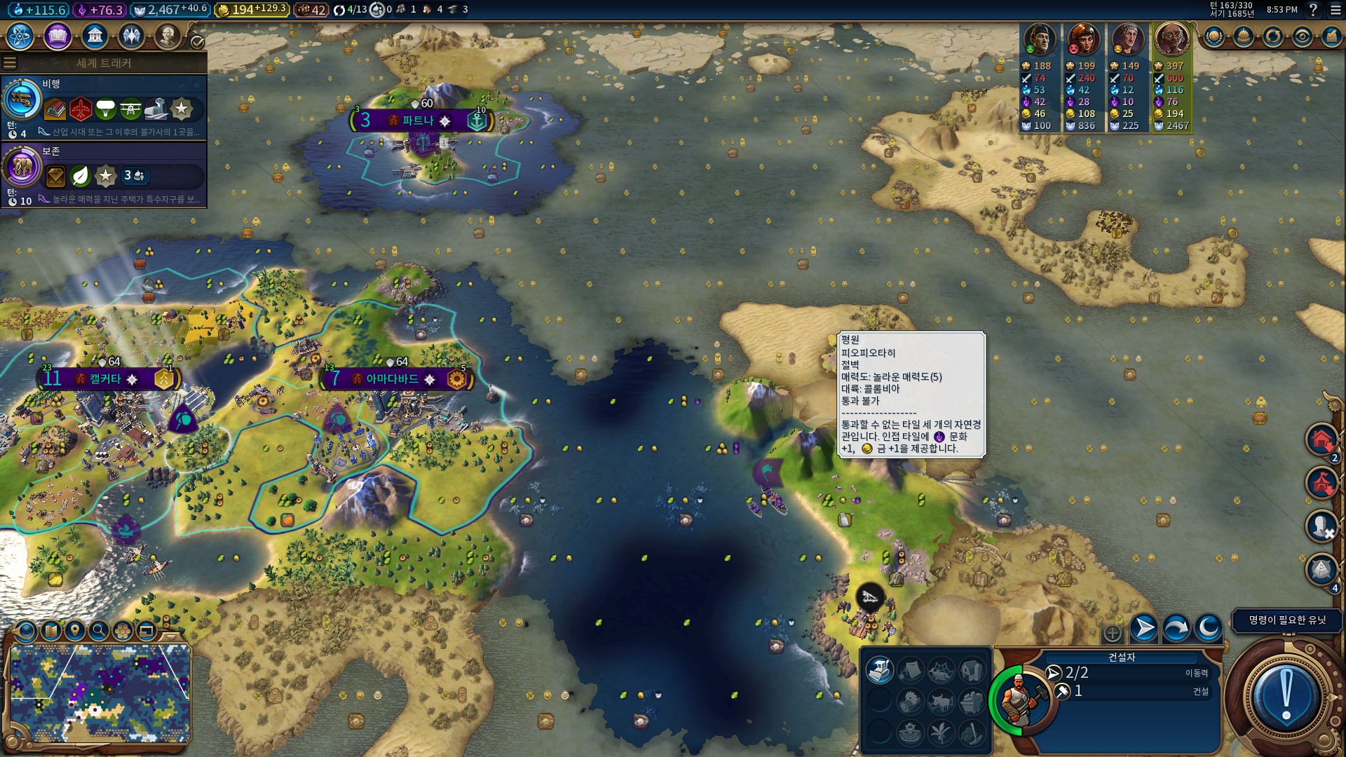 열대우림이 8타일이니 문화+16, 생산력+8의 효과.