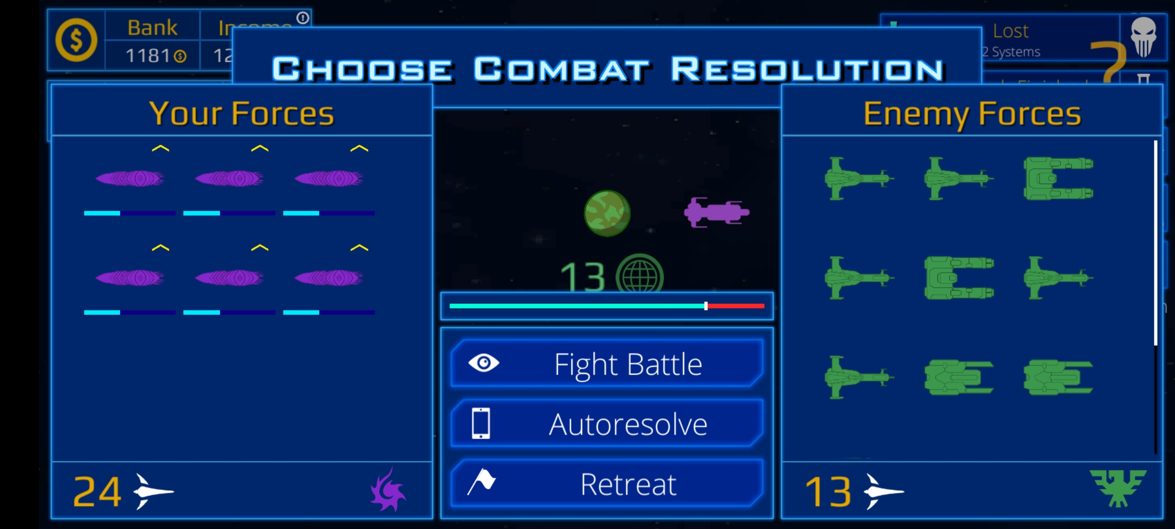 행성 아래에 있는 수치는 적들의 전력이고, 이것이 높다면 내 함대는 그곳에서 우주먼지가 될 거예요.