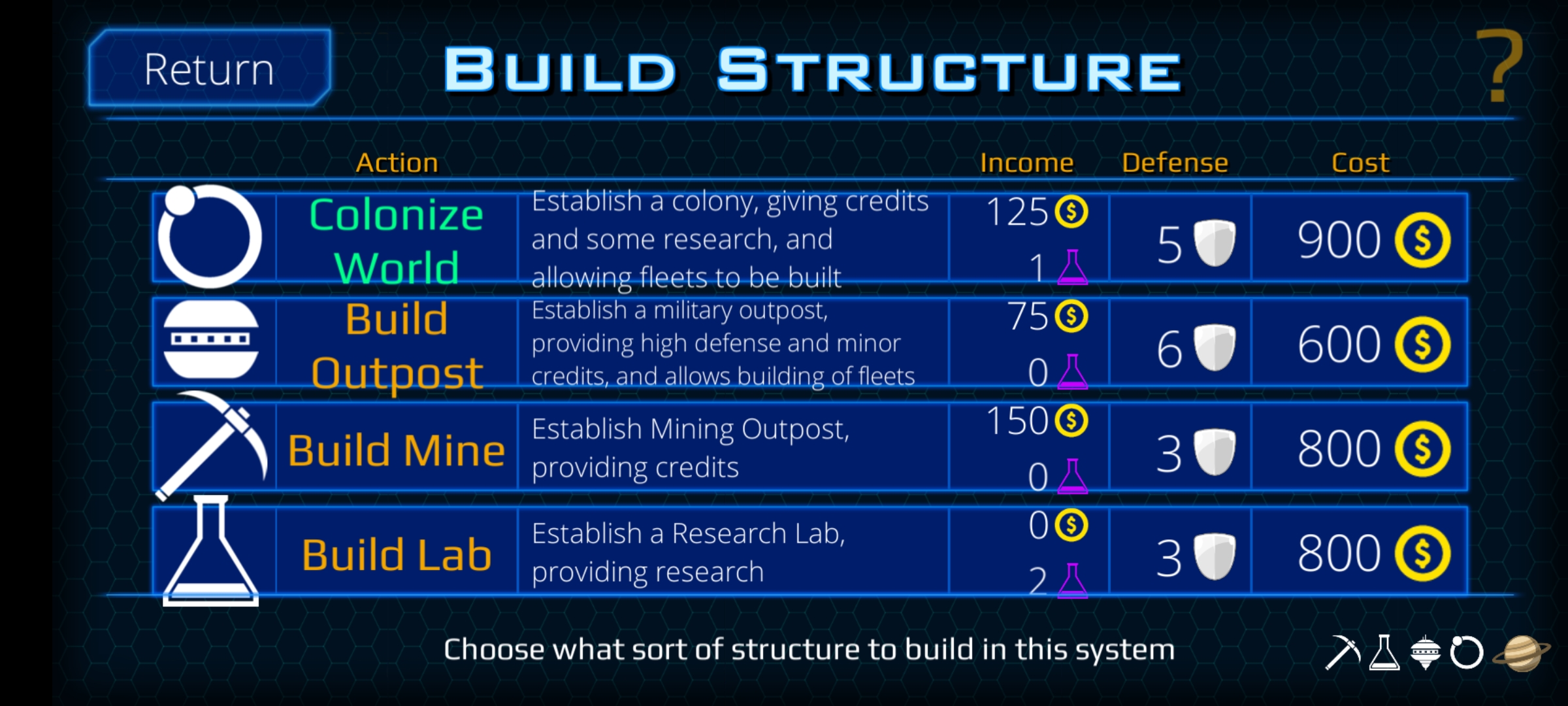 토성같이 생긴 행성은, 식민지나 광산, 연구소 모두를 지을 수 있어요.